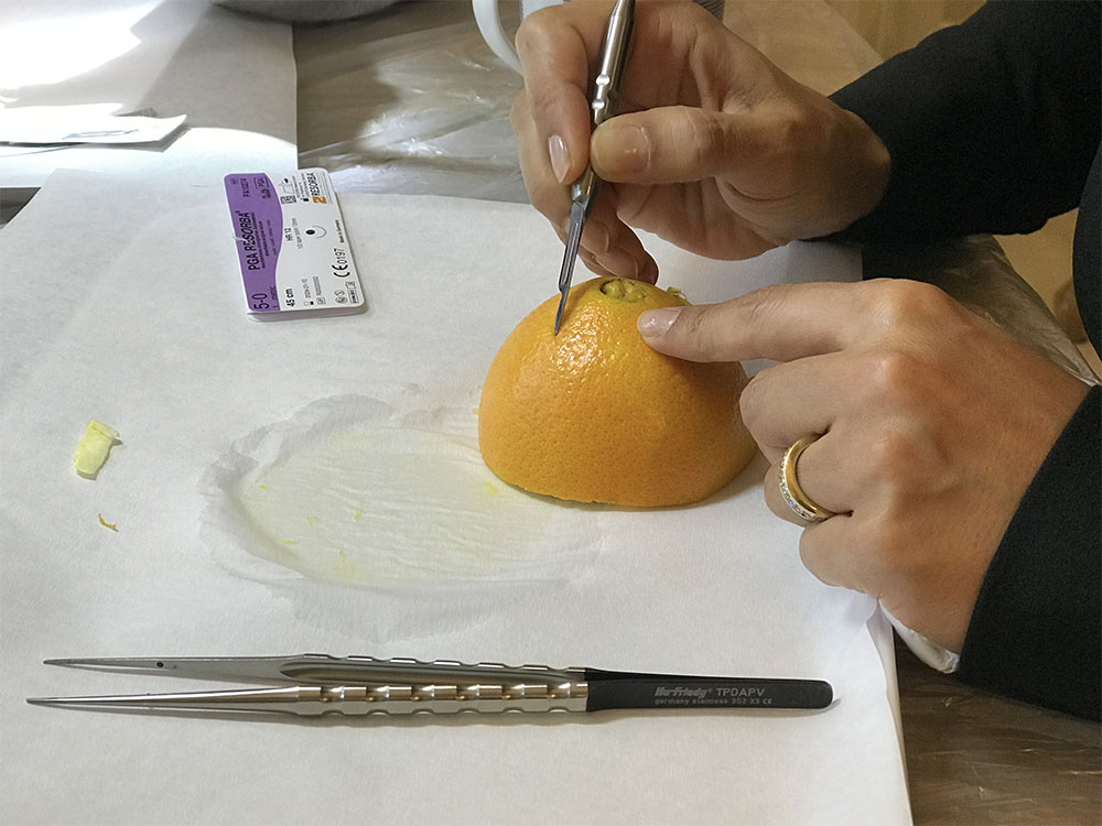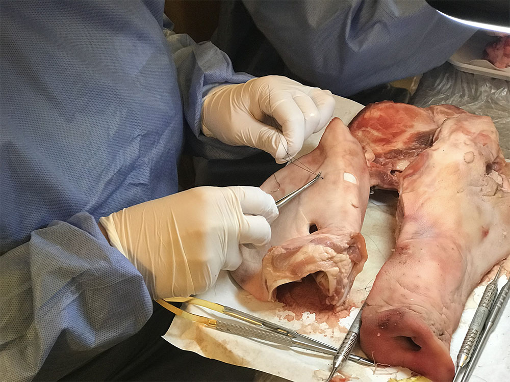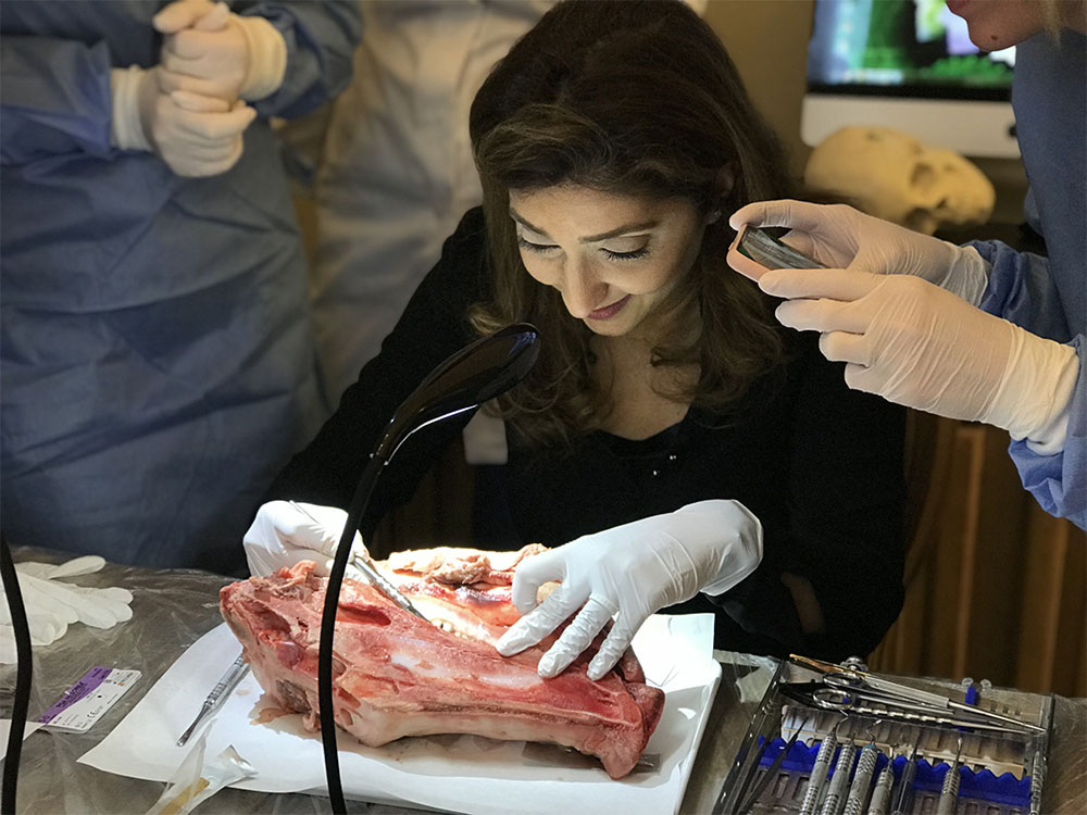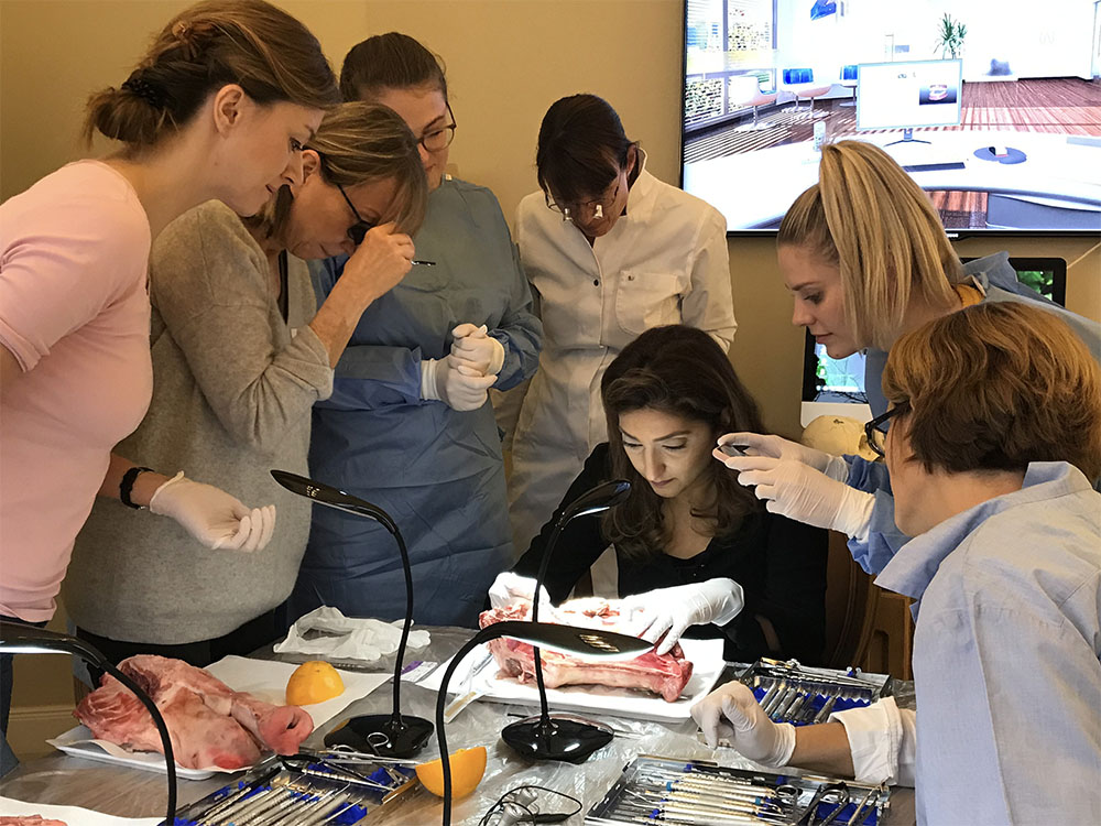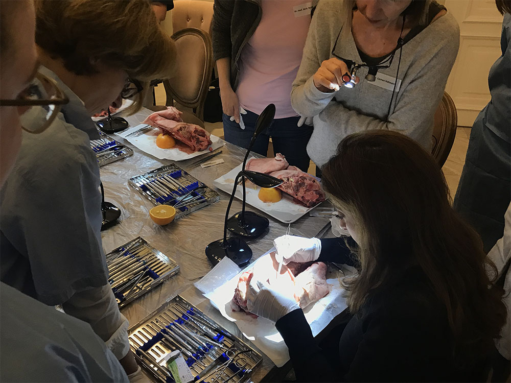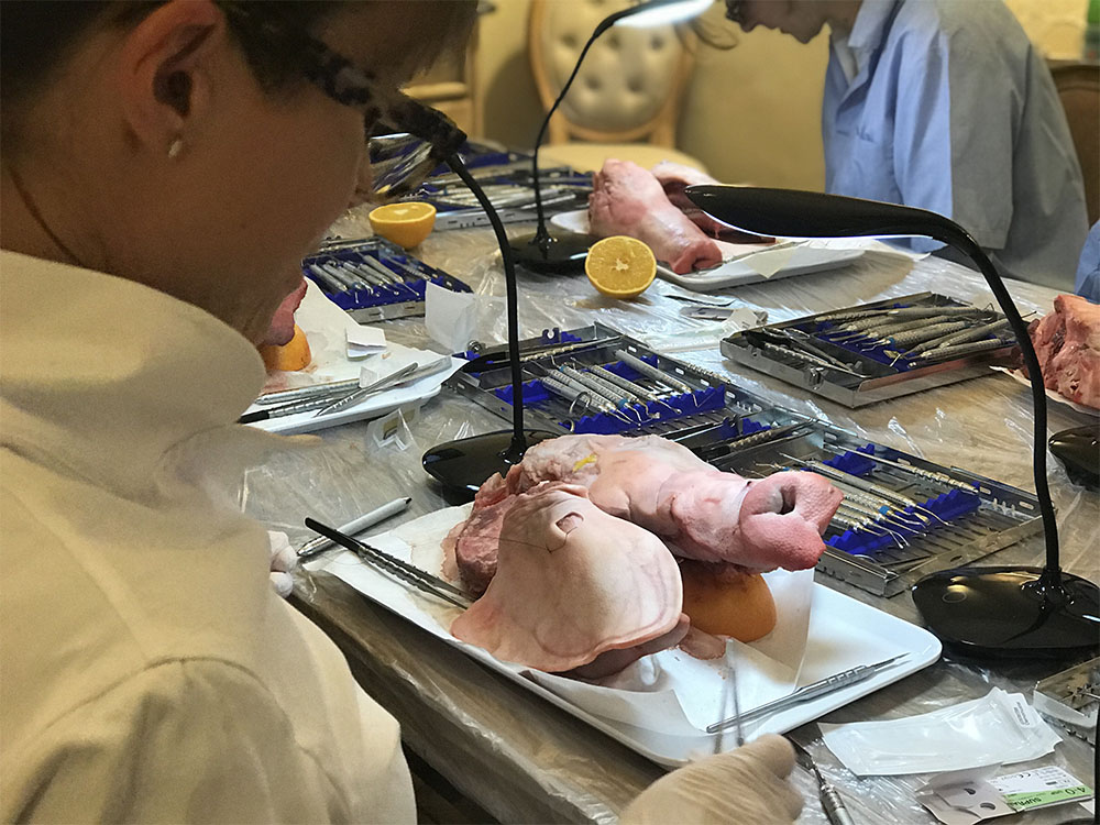 Am Vormittag wurden vier unterschiedliche Implantat-Freilegungen durchgeführt und besprochen, am Nachmittag erfolgte der Hands-on-Teil, bei dem die gezeigten Operationstechniken des Vormittages am Schweinekiefer nachoperiert werden konnten. Selbstverständlich vermittelte Dr. Behfar auch hier den dazugehörigen theoretischen Background.